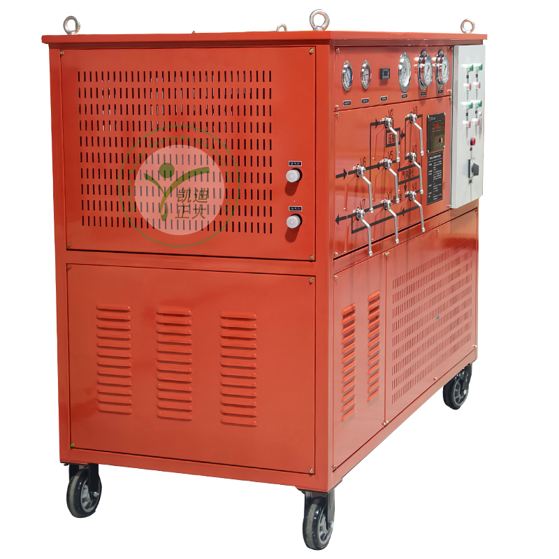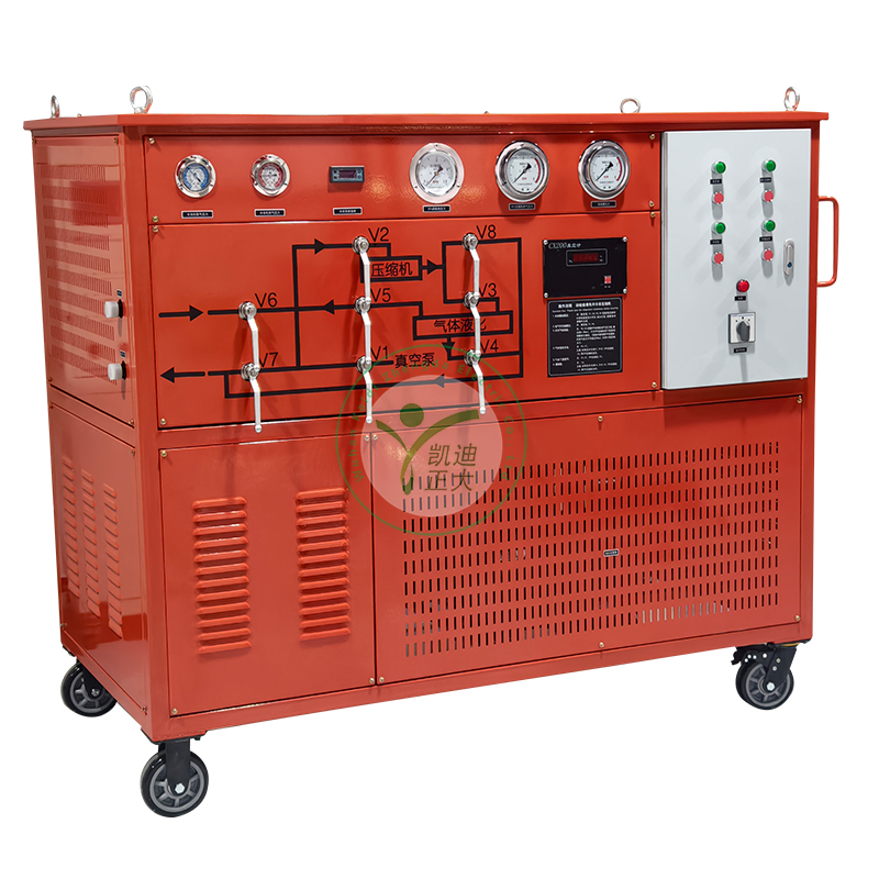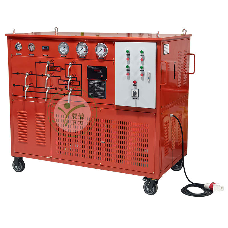 本裝置由SF6氣體回收凈化裝置組成。涉及的產品的主要優點為能直接將回收的SF6氣體以液態的形式貯存入容器,并能將GIS內的殘壓回收至53Kpa,擁有較小的體積,便于移動的放置,擁有較快的抽真空速度,能對回收的SF6氣體進行干燥和過濾,還能回充SF6氣體至SF6電氣設備。