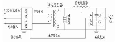 我們已知,在回路頻率f=1/2π√LC時,回路產(chǎn)生諧振,此時試品上的電壓是勵磁變高壓端輸出電壓的Q倍,Q為系統(tǒng)品質(zhì)因素,即電壓諧振倍數(shù),一般為幾十到一百以上。先通過調(diào)節(jié)變頻電源的輸出頻率使回路發(fā)生串聯(lián)諧振。再在回路諧振的條件下調(diào)節(jié)變頻電源輸出電壓使試品電壓達到試驗值,由于回路的諧振,變頻電源較小的輸出電壓就可在試品CX上產(chǎn)生較高的試驗電壓。
