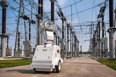 變電站中最高新的無軌智能巡檢機(jī)器人,有著擬人化的外形,頭部有眼睛、耳朵,軀體靠脖子與之連接,腳部為兩組大小不同的輪子。在高溫、大風(fēng)、暴雨等各種惡劣天氣下,智能機(jī)器人能代替人力,在電網(wǎng)設(shè)備的運(yùn)維中發(fā)揮重要作用。