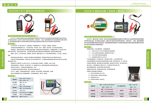 KDZD801/815蓄電池內阻測試儀抗干擾能力強,在嚴重干擾條件下,液晶屏最后一位數據能穩定在±1個字范圍內,讀數穩定,重復性好,采用最高新的液晶觸摸操作方式,人性化操作界面,外形美觀,體積小,重量輕,操作簡單,讀數穩定,重復性好。采用最高新液晶觸摸屏操作方式,人性化操作界面,外形美觀,體積小,重量輕,操作簡單,可以快速完成現場測量;存儲容量大,能夠在表內存儲5200節蓄電池的測試數據,并配備專用的計算機管理軟件,實現數據的存儲,同一塊電池不同時期技術狀態的對比,電池劣化趨勢分析等,從而實現可預見性地及時對蓄電池進行修復或者更換,避免發生電源斷電故障,智能化,數字化,全中文操作菜單,準確測量,操作簡單;重量不超過0.5kg,手持式與腰胯式雙重設計,單人操作,全程自動測量,滿足各種電池內阻檢測標準,須收錄齊全的蓄電池內阻參數數據庫,并能在儀表上進行結論性查詢和分析,也可將蓄電池測試數據用U盤導出到計算機軟件中生成圖表和曲線進行分析;測試報表可以方便的導入EXCEL和Word文件,并以指定的格式打印成報告,方便管理,以減少工作量,四端多用途測試夾,集測試夾,探針等功能于一體,能夠適應98%以上的電池連接安裝方式和電池連接安裝方式和電池極柱形式,在強紋波干擾情況下,可準確在線測試蓄電池電壓,內阻。可按照用戶需求定制更新儀表程序,最高新的交流放電測試方法;設計小巧,重量輕,方便使用者攜帶及操作,儀器功能,單節電池測量,成組電池測量,示波器,采用按鍵作操作也可以采用觸摸屏操作,可任意選擇測試夾,測試針,測試鉗。
