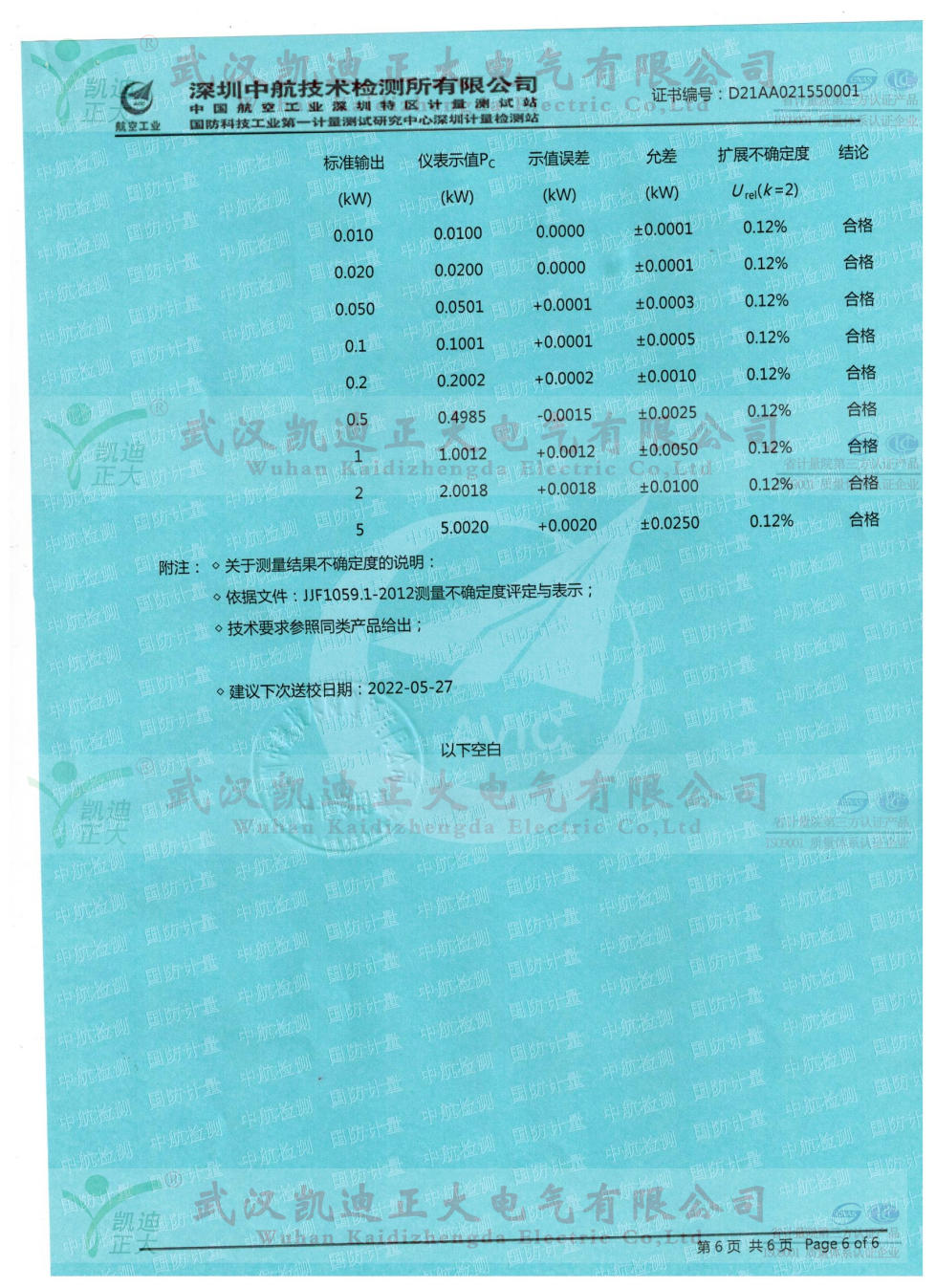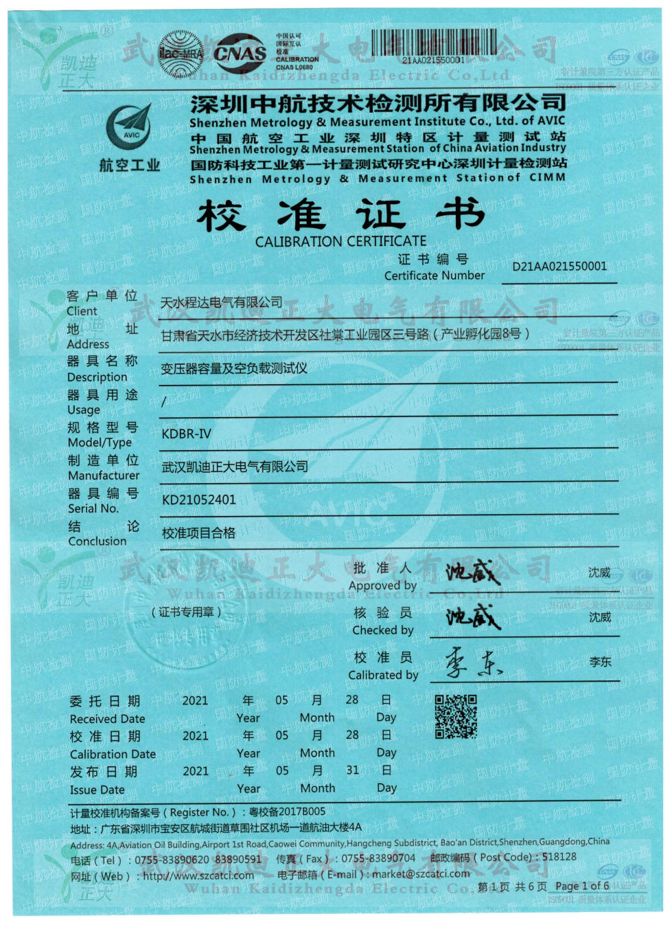 5月初,接市場部要求將KDBR-IV變壓器容量及特性測試儀送檢中國合格評定國家認可委員會(CNAS)深圳中航技術(shù)檢測所檢定,獲得校準(zhǔn)合格證書。