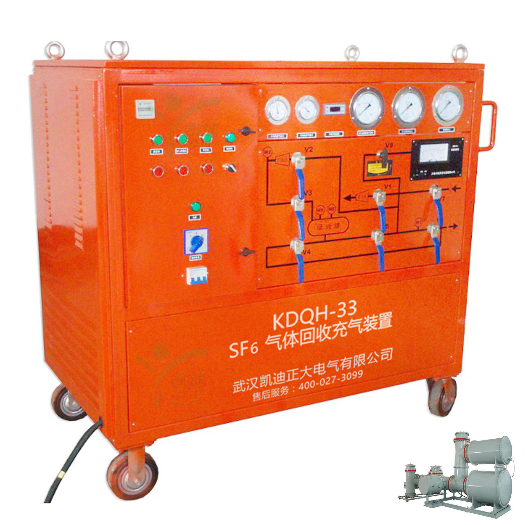 KDQC-33便攜式抽真空充氣裝置、KDQH-33六氟化硫氣體回收凈化裝置主要應用于各供電公司、送變電工程公司、發電廠、超高壓輸變電站、SF6電器開關制造廠等部門,作為GCBP、GCBT、GIS等SF6電器產品在安裝、調式、檢修時使用的輔助設備。對上述電器產品進行抽真空、回充SF6氣體操作,同時本裝置亦可用作其它部門抽真空和回充氣體的設備。