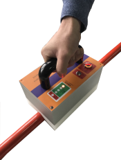 (4)將檢測儀v形電極對準桿、棒、繩索并滑動使其全部通過檢測,觀察led顯示屏狀態(tài):一旦紅色的燈亮起,表示被測物體不合格,將檢測儀轉向再做幾次測試。若被測試品直徑超過39mm,將桿或管旋轉90度再做幾次測試。