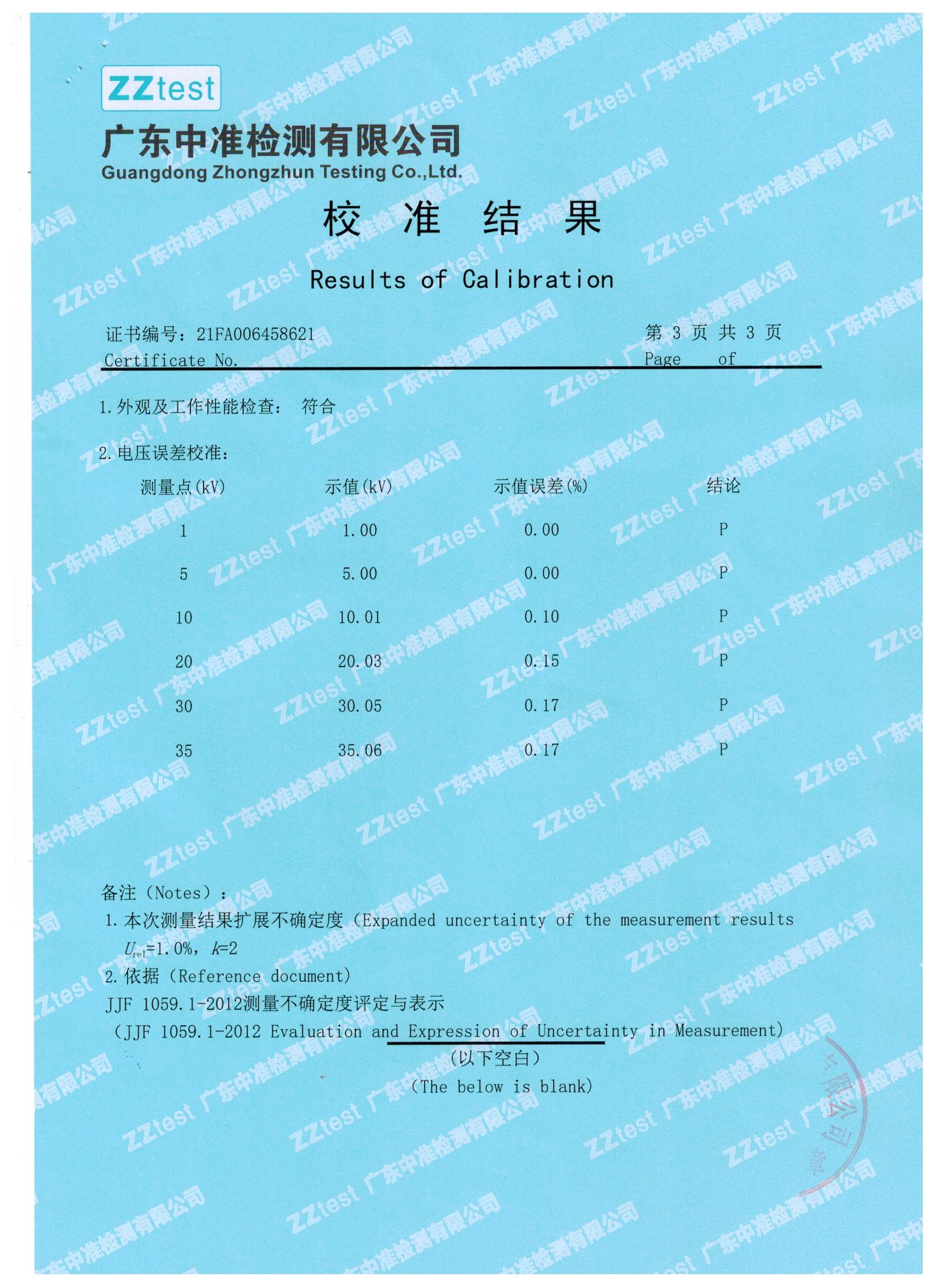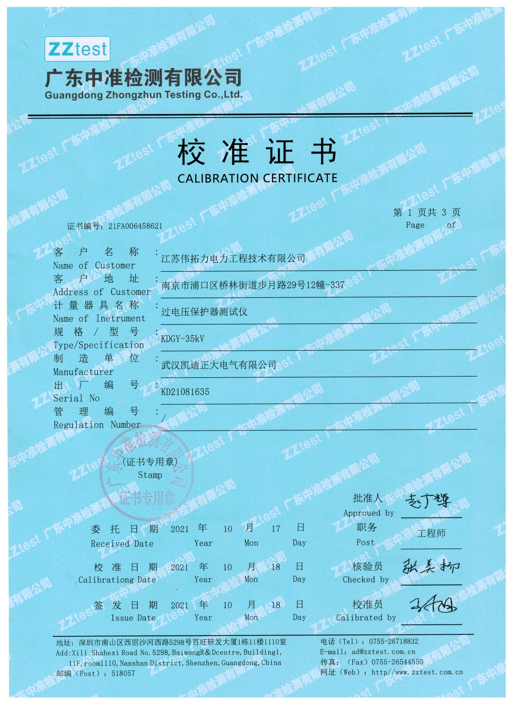 我們一直嚴(yán)把質(zhì)量關(guān),下面就是我們與江蘇偉拓力合作的過(guò)電壓保護(hù)器測(cè)試儀設(shè)備送檢結(jié)果