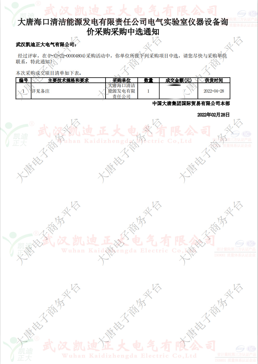 遲日江山麗,春風(fēng)花草香。祝賀我司商務(wù)部再次接到中國(guó)大唐海口清潔能源發(fā)電有限責(zé)任公司電氣實(shí)驗(yàn)室儀器設(shè)備詢價(jià)采購(gòu)采購(gòu)中選通知。