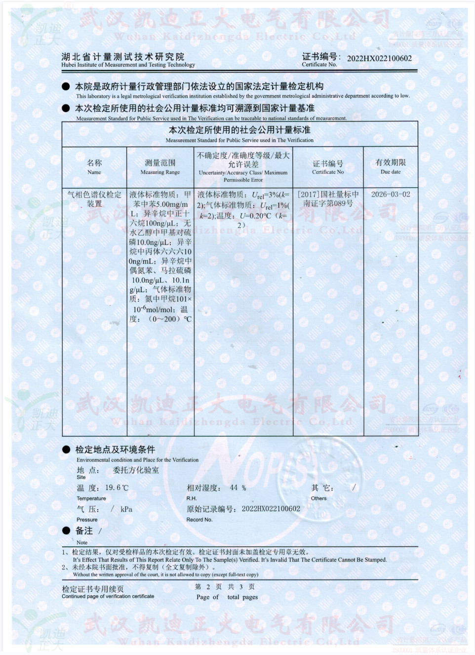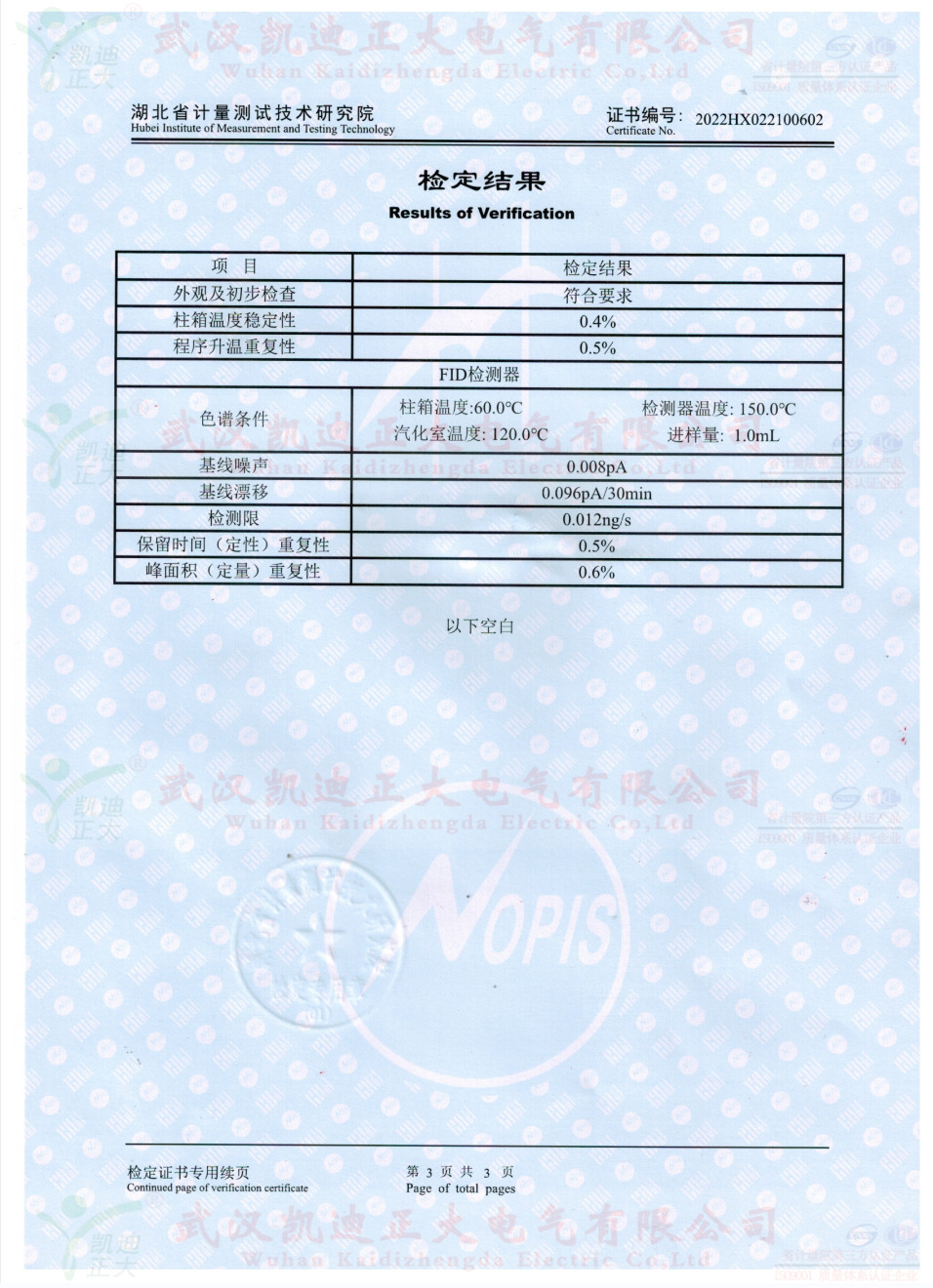 獲得國網(wǎng)湖北省電科院蔡工的青睞,了解了色譜儀的性能后,要求設備獲得湖北省計量院檢定報告。2022年10月,我司生產(chǎn)好KDZD9560氣相色譜儀后,按照JJG700-2016《氣相色譜儀檢定規(guī)程》進行送檢,檢定結(jié)果為合格。送檢單位電力工業(yè)電氣設備質(zhì)量檢驗測試中心,計量器具KDZD9560氣相色譜儀符合相關標準。