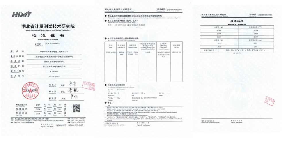 KDZD880便攜式智能蓄電池維護(hù)儀在交付前,順利通過(guò)了湖北省計(jì)量測(cè)試技術(shù)研究院的嚴(yán)格檢測(cè)。此次檢測(cè)嚴(yán)格遵循JJF 1587-2016《數(shù)字多用表校準(zhǔn)規(guī)范》,對(duì)設(shè)備的測(cè)量精度、穩(wěn)定性、安全性等關(guān)鍵指標(biāo)進(jìn)行了全面評(píng)估。結(jié)果顯示KDZD880的各項(xiàng)性能指標(biāo)均達(dá)到標(biāo)準(zhǔn)要求,為用戶的信賴與選擇提供了堅(jiān)實(shí)的數(shù)據(jù)支撐。