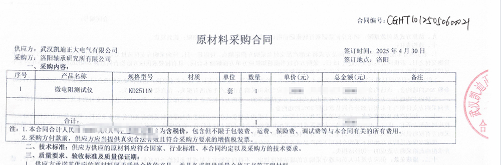 近日,洛陽軸承研究所有限公司經過嚴格篩選與深入考察,最終決定采購信賴武漢凱迪正大,采購了KD2511N微電阻測試儀。此次合作不僅彰顯了客戶對武漢凱迪正大品牌的深度信賴,也驗證了KD2511N微電阻測試儀在市場上的表現與廣泛認可。