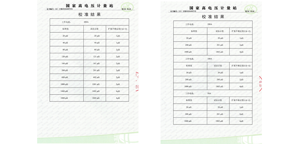 在校準過程中,國家高電壓計量站采用了最大充許誤差為±0.1%讀數的直流大功率標準電阻作為校準器具,校準環境為溫度21℃℃、濕度56%RH。校準內容包括對測試儀在600A、200A、100A、50A不同電流下的測量結果。經過一系列嚴格的測試和比對,KDHL-600A回路電阻測試儀成功通過了校準。