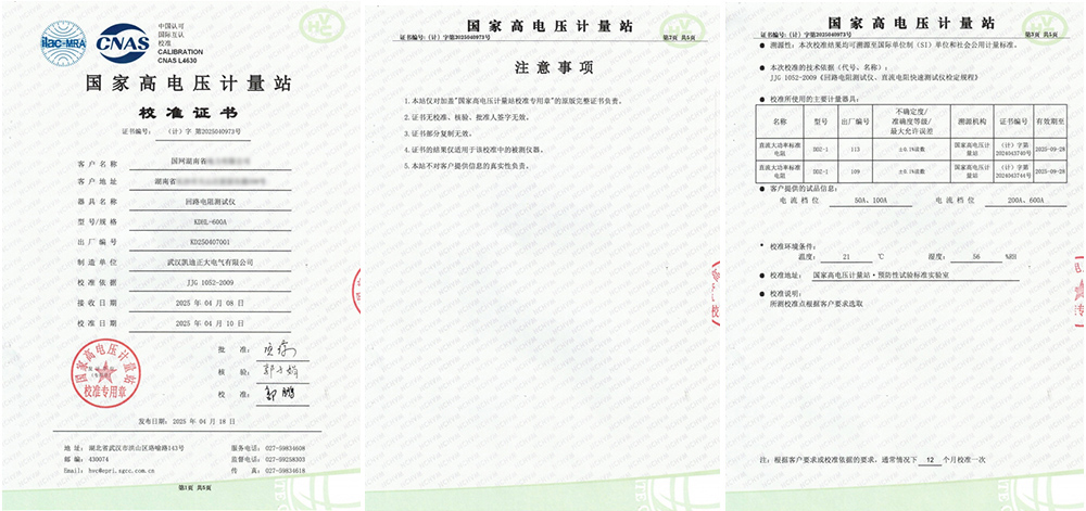 近日,國網湖南省某有限公司采購的武漢凱迪正大KDHL-600A回路電阻測試儀,順利通過了國家高電壓計量站的嚴格校準,并獲得了校準證書。